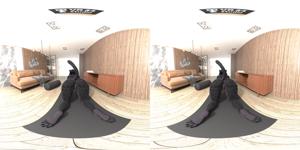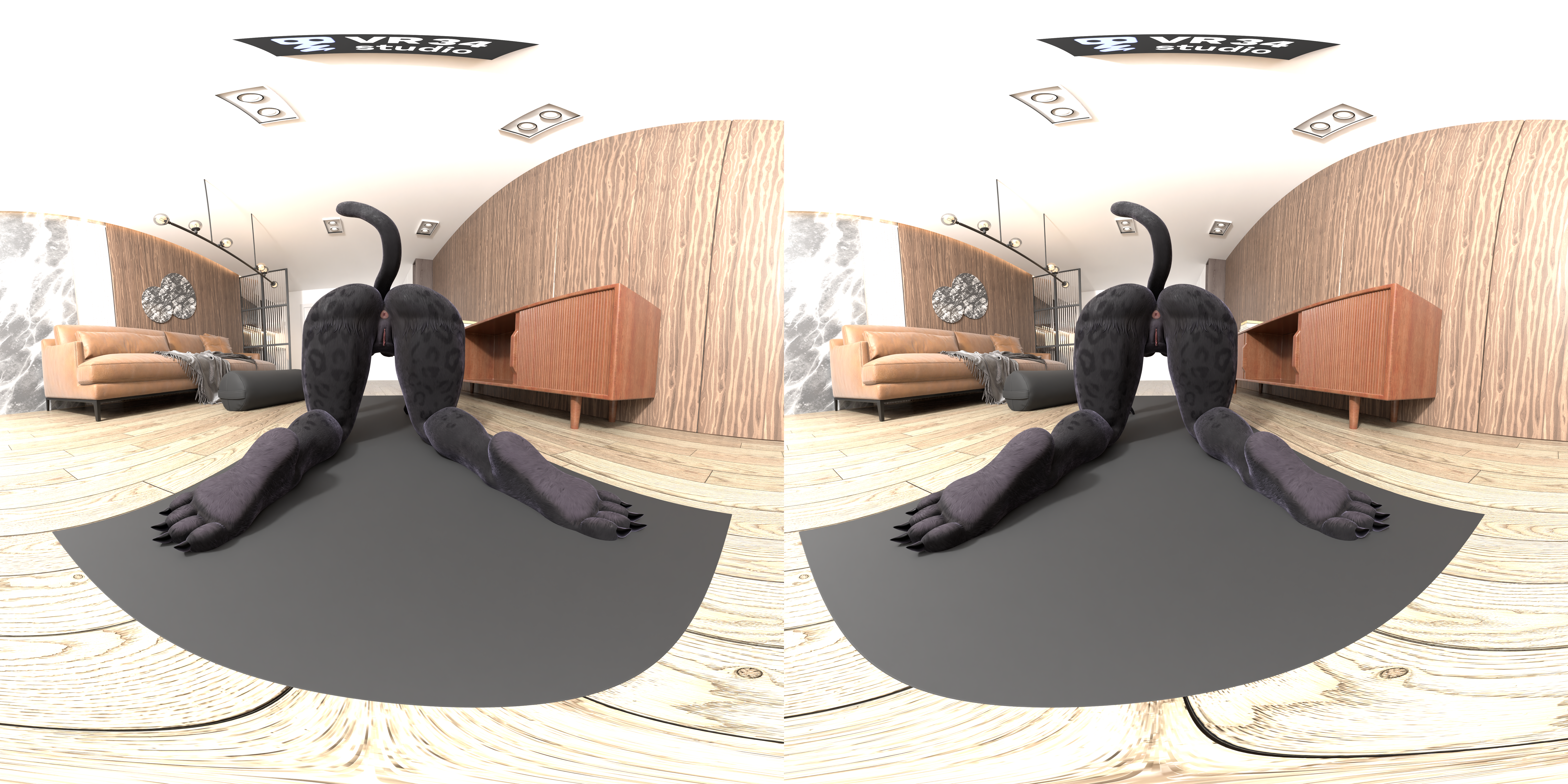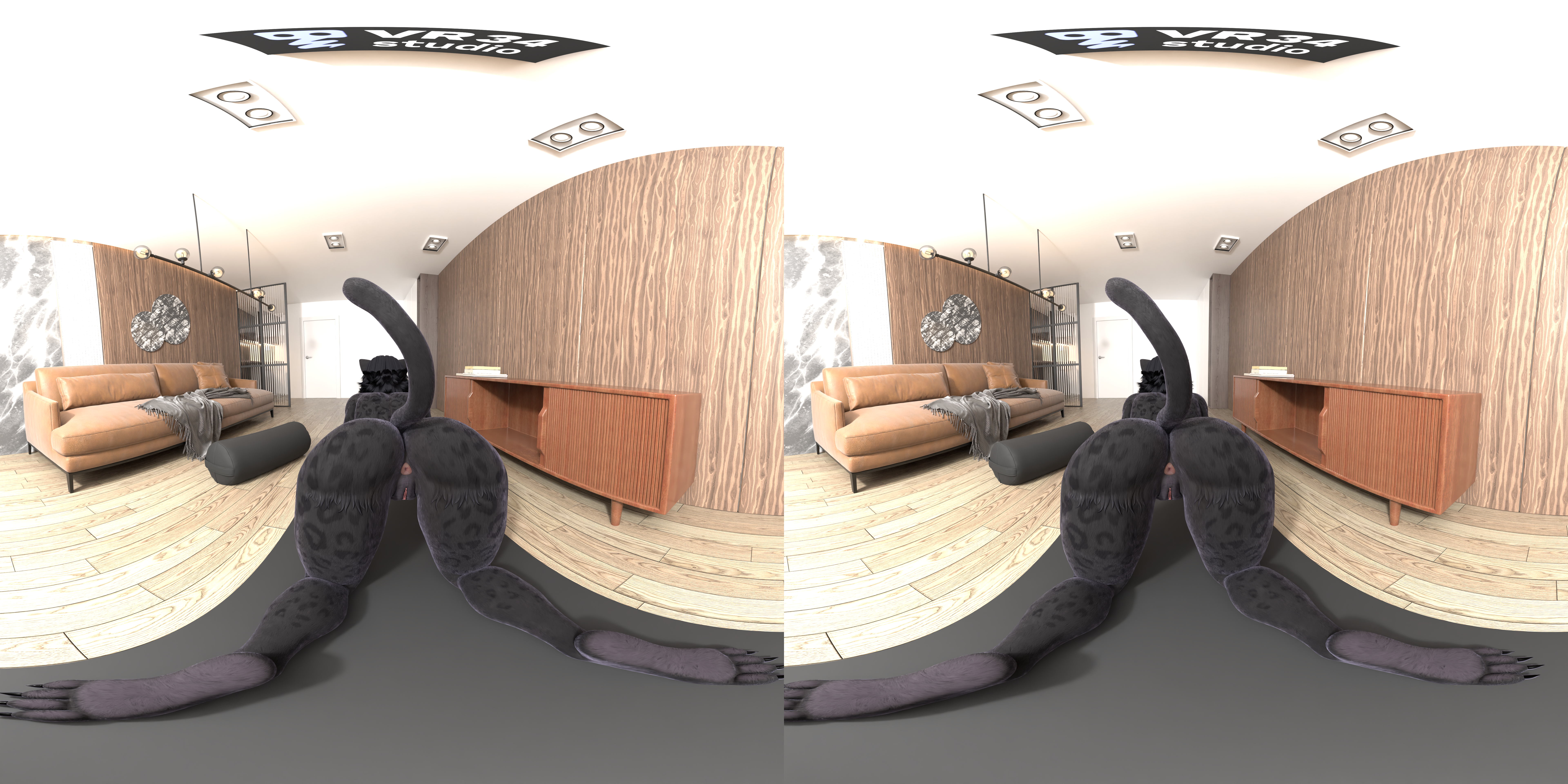 Shani Panther, a furry character, is naked in her living room, on her knees, teasing the camera as she moves her ass from side to side. Available in VR, this porn video shows her playful movements up close.